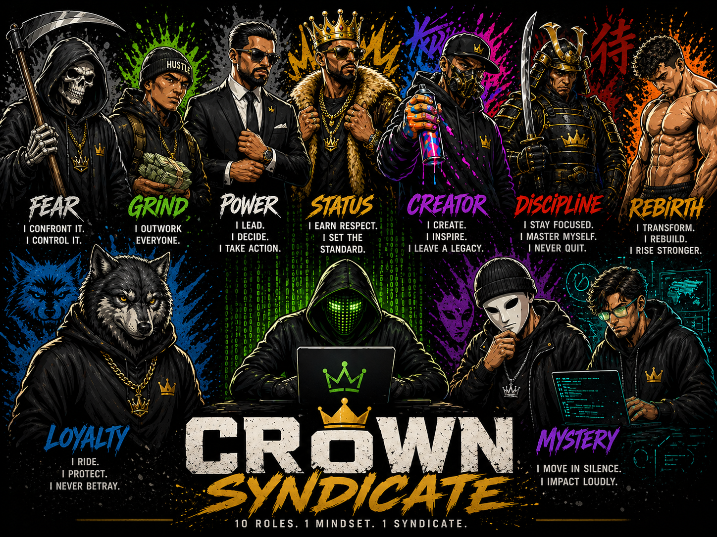 Crown Syndicate combines loud street graphics with premium core pieces. Each hero character represents a role customers can connect with and wear.